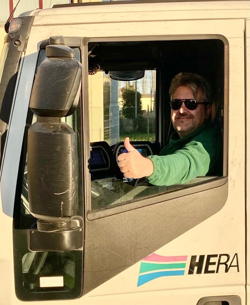 Michele Donati, a 45-year-old from Ferrara, always out on the road. Since July 2020, he has been the driver of a mobile container bin lorry for the Waste Management Department of Hera, after 20 years as a coach driver for a well-known transport company.