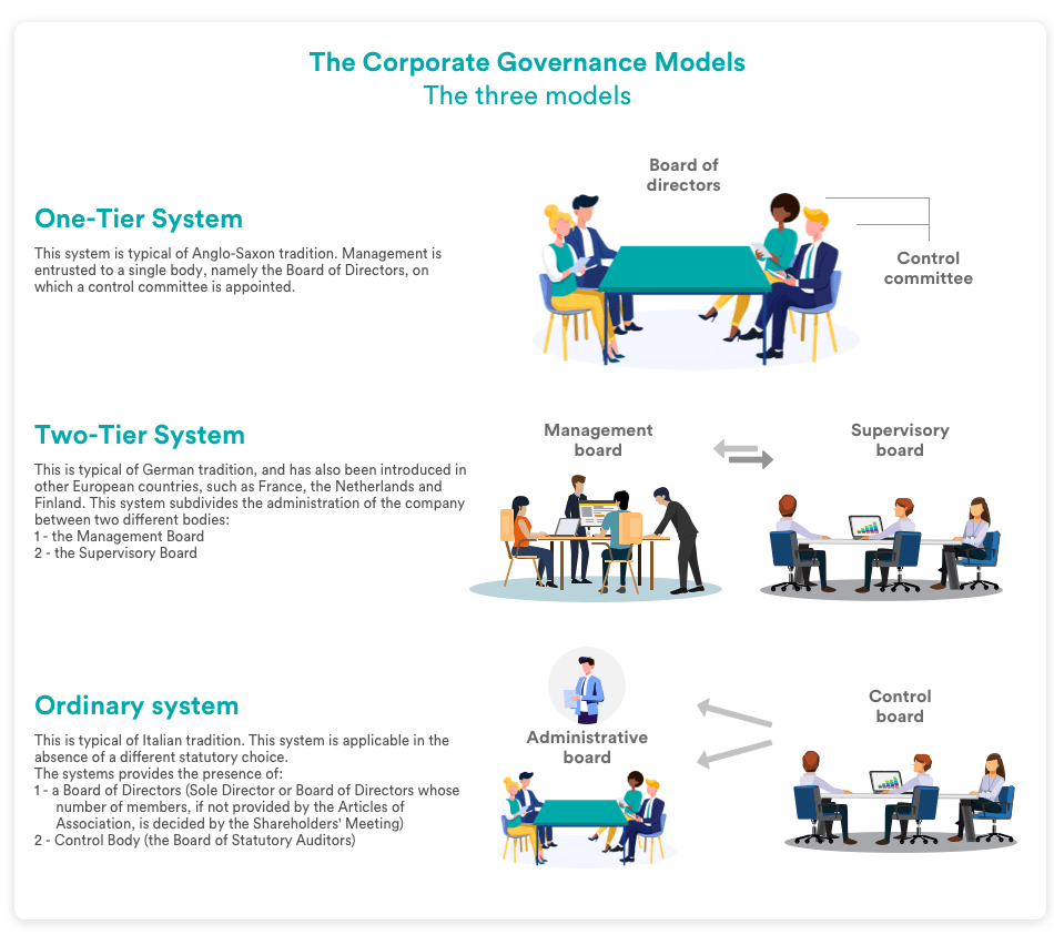 There are different models of governance depending on the different level of capitalism in which the company operates. The liberal model, typical of Anglo-Saxon countries, gives priority to the interests of shareholders. The prevailing model in continental Europe and Japan also recognises the interests of workers, managers, suppliers, customers and companies.