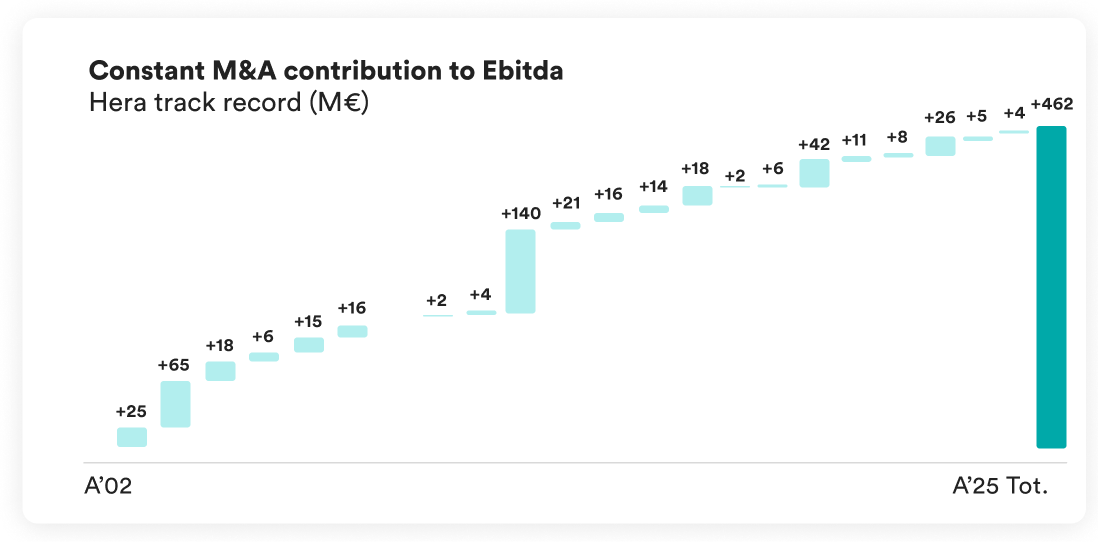 M&As have made a constant contribution to Hera’s history of growth, amounting on average to 20 million euro per year in terms of Ebitda.