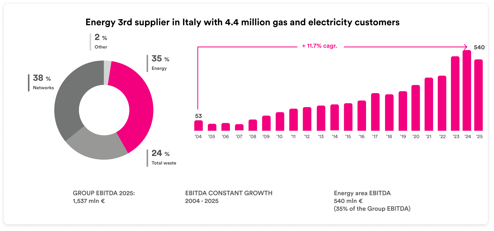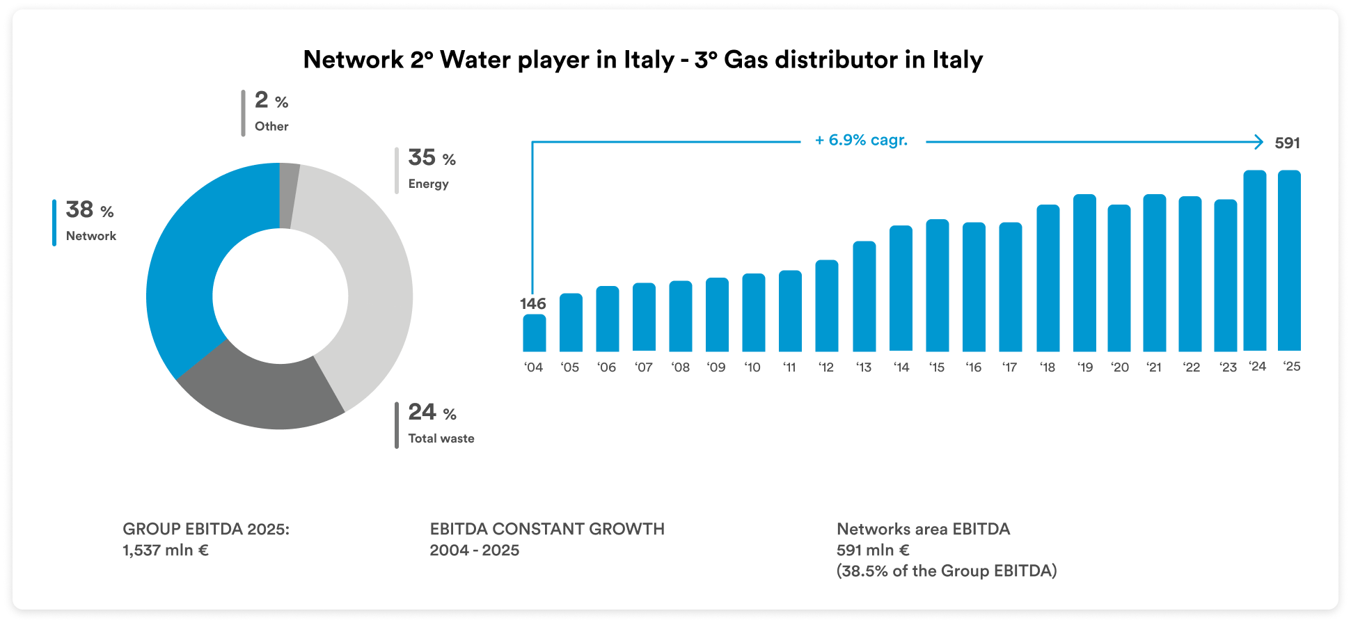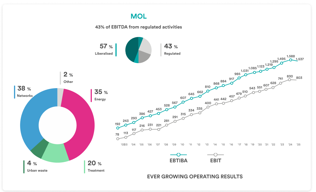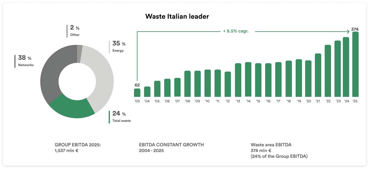 This growth is furthermore due to the low risk profile it has maintained, thanks to a considerable portion of regulated activities (gas, electricity and water distribution, district heating, and urban waste collection), which are managed as local monopolies based on public grants, and the competitive advantages gained by the Group in free-market activities.