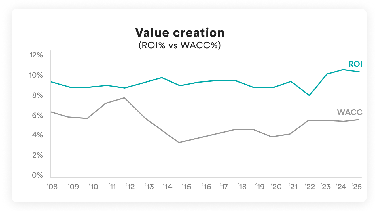 The value creation generated by this particular business model can be gauged by the difference between the business portfolio’s operating profitability and the cost of capital (wacc), which has constantly remained positive.