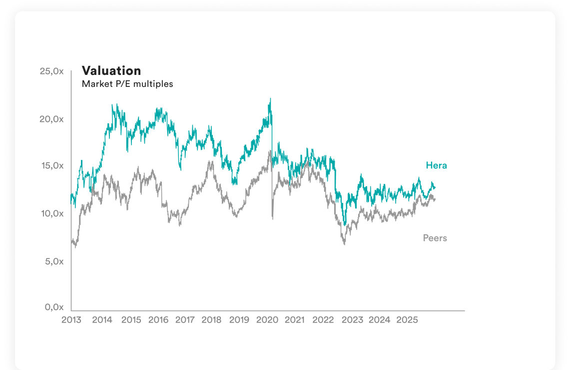 For many years now, the market has shown its willingness to assign a higher value (Bonus) to Hera stock than its peers. This is because the resilience of its business portfolio, its model for growth, the quality of its results and its stable governance give investing in Hera a lower level of risk compared to other shares in the same sector, with better prospective for growth.