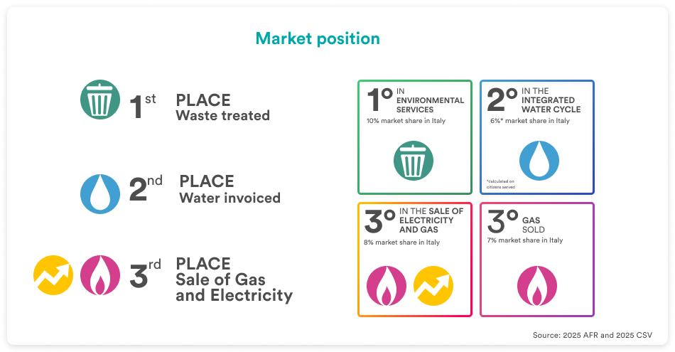 Our growth is due not only to the quality of the services we provide and our roots in the local area, but also to a strong focus on sustainability both in operating regulated services such as gas and electricity distribution, water service and waste collection, and in free market services, such as special waste treatment, and gas and electricity sales.