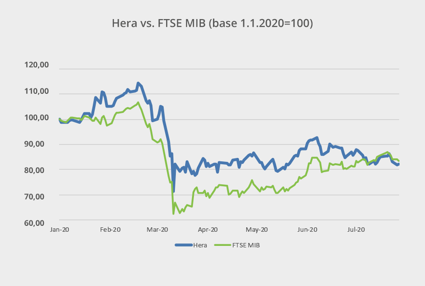 Despite the volatility of the Hera shares proved far lower than that of the market, over the last few months the stock price followed a non-linear path, with some significant fluctuations amid relatively modest volumes. Once the recovery phase started, Hera’s shares continued to outperform the blue chips’ index of the Italian market through early July, while its performance converged to that of the FTSE MIB index latter days. It should be considered that on 6 July 2020 Hera has distributed a dividend of 10 euro cent per share, resulting in a one-off gap that the price is gradually closing.