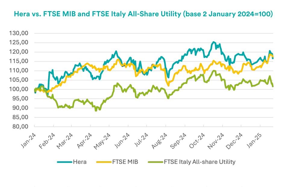 Hera continues to show robust performance against benchmark indices, even though the prospects for M&A in the banking sector have fueled a conspicuous recovery of the FTSE MIB in recent weeks. Moreover, the outperformance of the stock compared to the Italian utility sector index remains very strong.