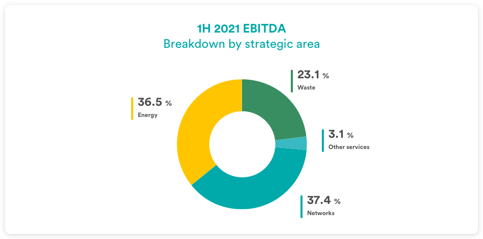 The Energy areas provided the largest contribution (+31.7 m€) to consolidated growth, achieving a 16.4% EBITDA increase. In the first half of 2020, this area resulted in being the most penalised by Covid-19.