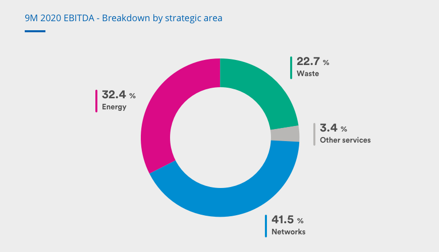 In the consolidated financial statements, Networks show a decrease in EBITDA of 2.4%. Actually, on a like-for-like basis, Networks achieved a progress of 1.0% (+3.4 m€), although the tariff revision in gas distribution had a negative impact of 7 m€, since in the remaining businesses the regulation has recognised the quality of assets and service. The 2.4% EBITDA reduction in this area is therefore a reflection of the spin-off of Hera’s gas distribution networks in Padua and Udine, as envisaged by the Ascopiave deal (-€11.6 m€ impact on the first nine months of 2020).