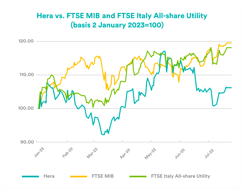 From the year’s low of 2.38 euro on 13 March, on the back of solid fundamentals, Hera’s share price had made an upward movement that took it to a high of 3.03 euro on 15-16 May. Despite the sound quarterly results, the share later retraced, touching a period low of 2.61 euro on 10 July, from which it has recently pulled back, recovering to around 2.75 euro. Hera is now up about 10% since the beginning of the year, thus in line with the performance of the Stoxx Europe 600 index. However, it should also be considered, in terms of Total Shareholder Return, that as of 21 June our shareholders have been paid a dividend per share of 12.5 euro cents, which represents a yield of around 5% on the 2022 year-end price.