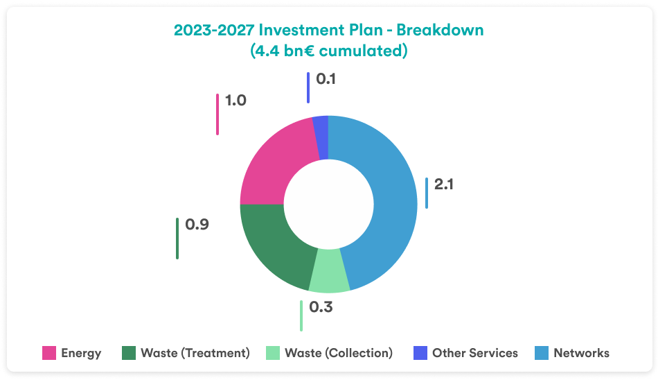 The 4.4 bn€ investments Hera has planned for the 2023-2027 five-year period will mainly focus on Networks, for about 2.1 billion euro. One billion will be dedicated to projects in the Energy area. A total of 1.2 billion will be allocated to Waste, of which 900 million euro in the free market business.